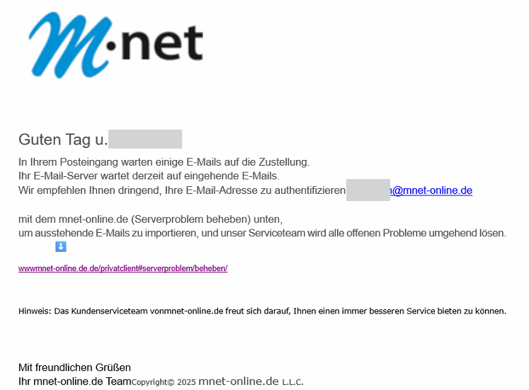 Derzeit kursiert eine täuschend echt aussehende Phishing-Mail im Namen von M-Net. In der Nachricht wird behauptet, dass sich angeblich „E-Mails im Posteingang stauen“ und man seine Adresse „authentifizieren“ müsse, um Serverprobleme zu beheben.